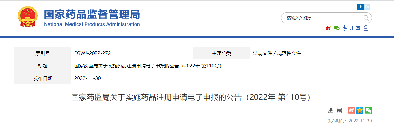 2022年11月30日,国家药监局关于实施药品注册申请电子申报的公告(2022年 第110号)